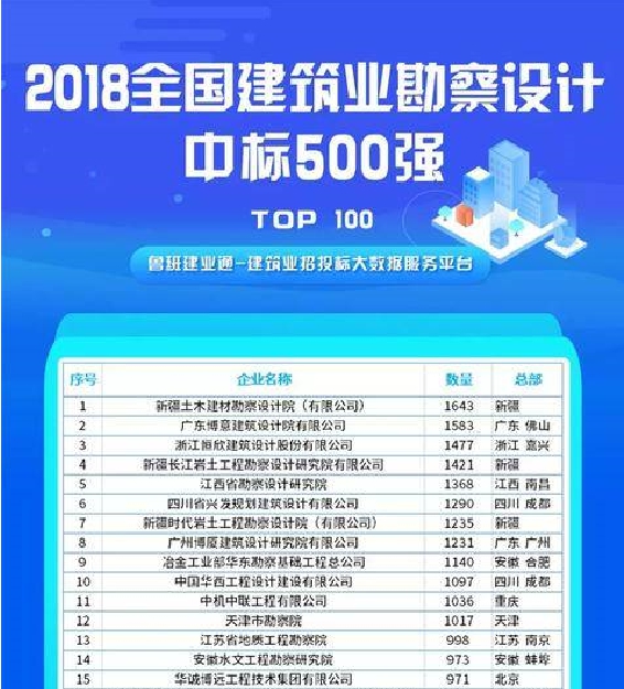 据建筑业招投标大数据服务平台——鲁班建业最新通报,勘基总公司以总数1140个工程勘察中标项目的优异表现上榜2018年全国建筑业勘查设计中标量500强,列居全国第九。