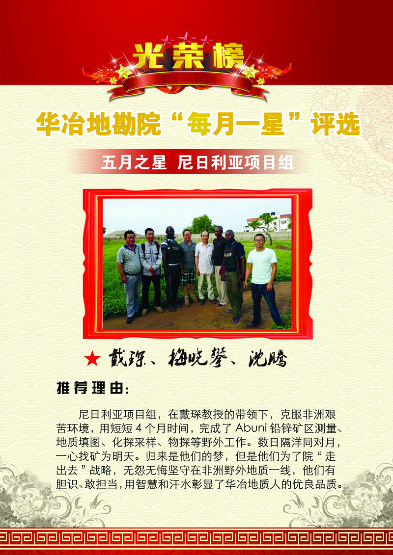 活动开展以来,尼日利亚项目组当选为 “五月之星”,该项目组在戴琛教授带领下,克服非洲艰苦环境,无怨无悔坚守非洲野外地质一线,有胆识有担当,在短短四个月的时间内高质量完成野外勘探工作,彰显了该院地质人的优良品质,“五月之星”当之无愧。